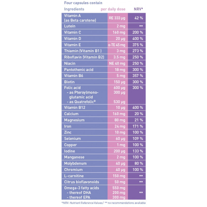 مع 600 غرام من حمض الفوليك، حمض الفوليك النشط بيولوجيًا (كواتريفوليك) بالإضافة إلى حمض الفوليك.