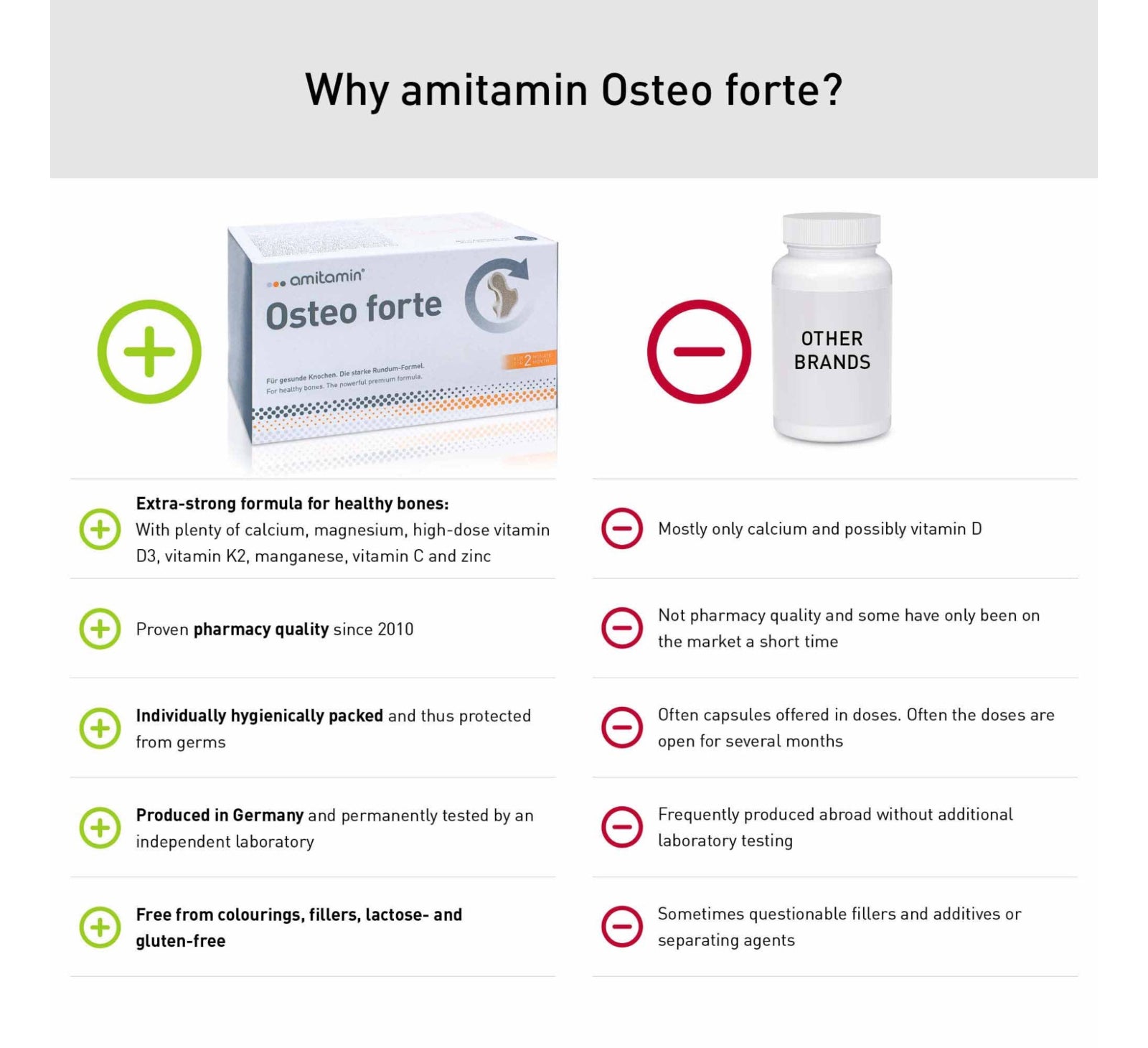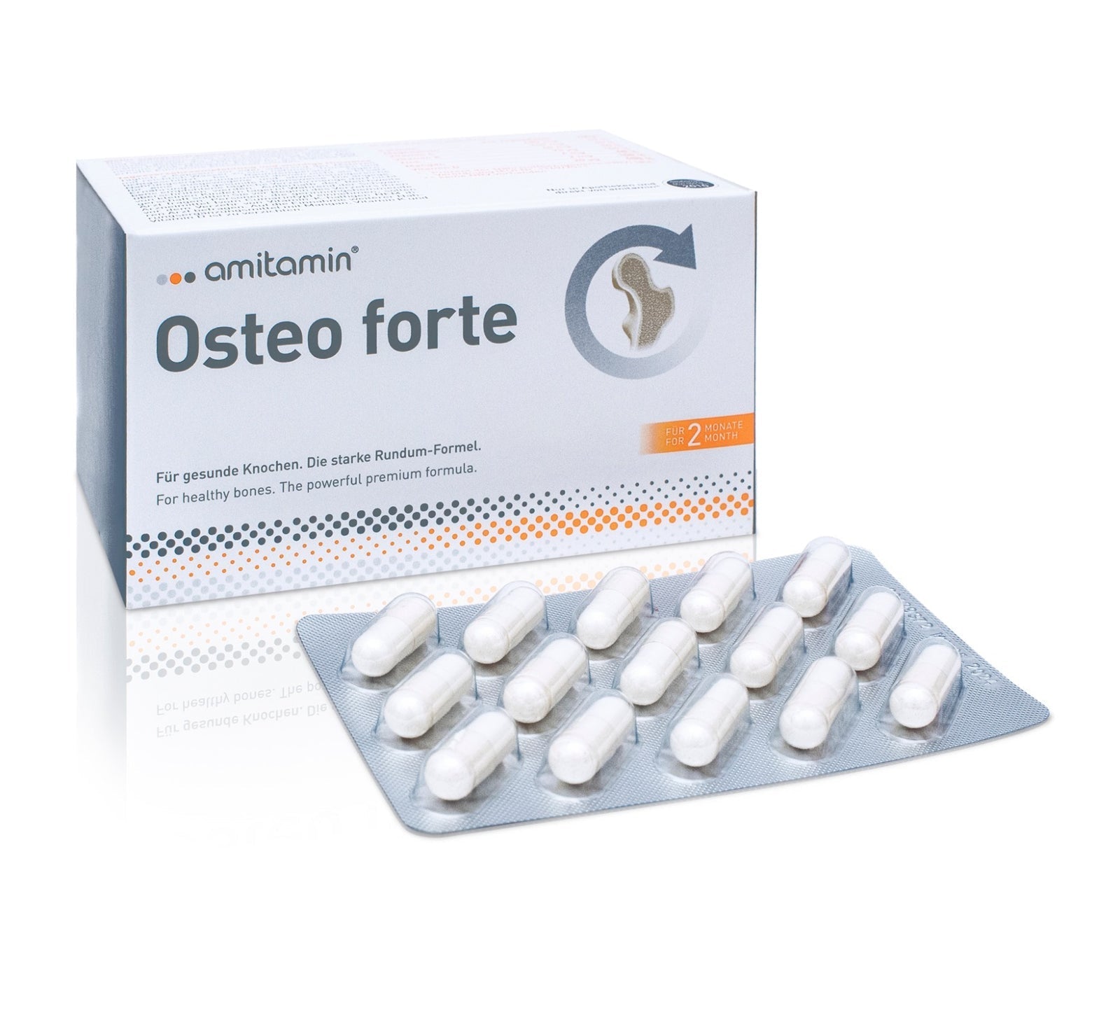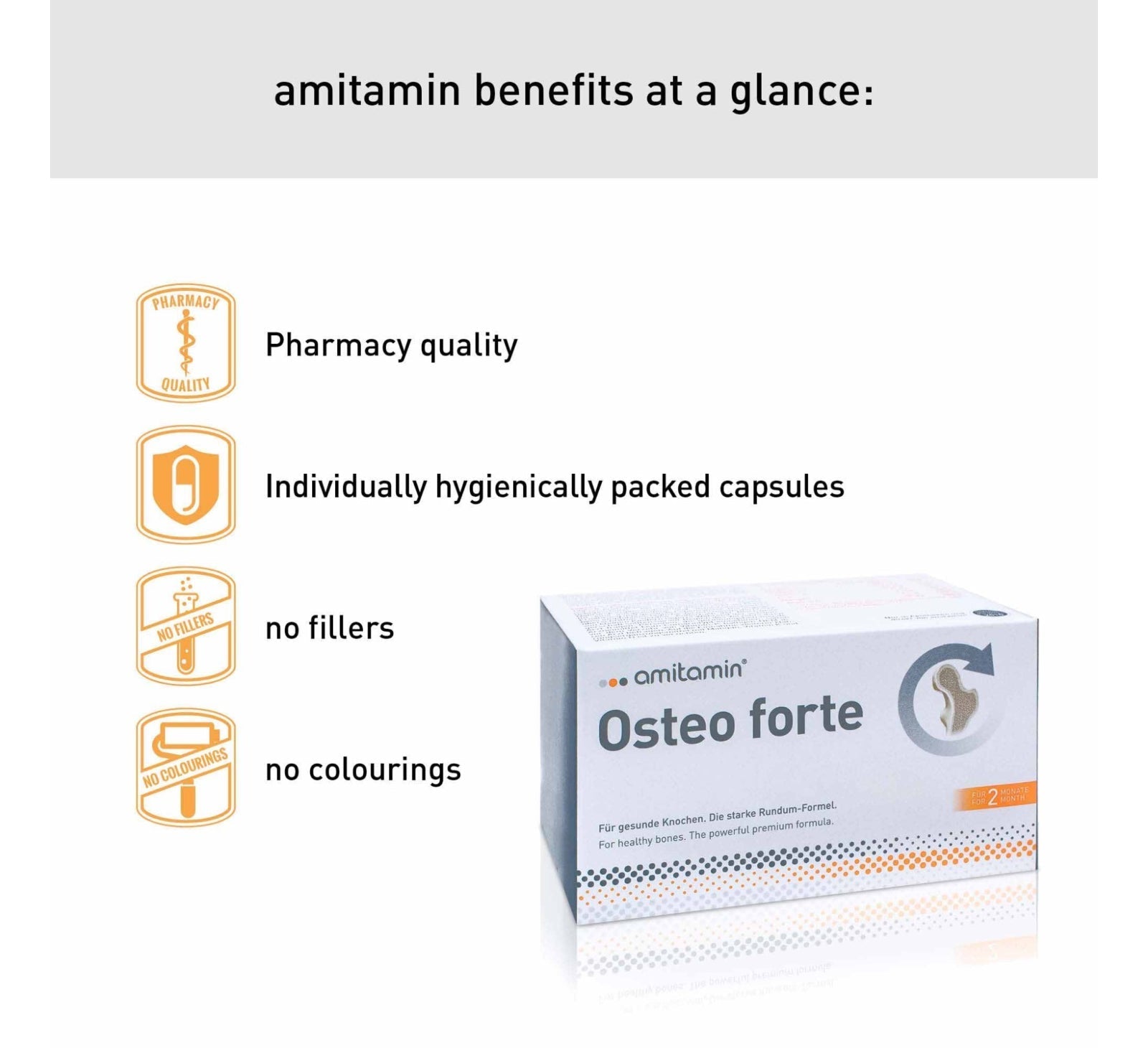 الفيتامينات والعناصر النزرة الموجودة في أميتامين® أوستيو فورتي مُتوازنة وجرعات عالية. وهي تدعم بشكل خاص الحفاظ على صحة بنية العظام (فيتامينات ج، د، الكالسيوم، المغنيسيوم، الزنك، والمنجنيز). طُوّر أميتامين® أوستيو فورتي للاستخدام المستمر وطويل الأمد.